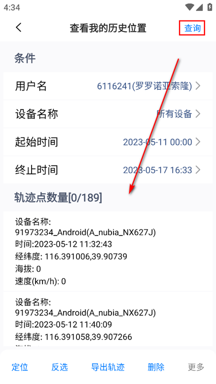 在【查看我的历史位置】页面中,设置用户名、设置名称、起止时间等查询条件,点击【查询】按钮,即可查询出指定设备在某时间段内的历史位置信息。