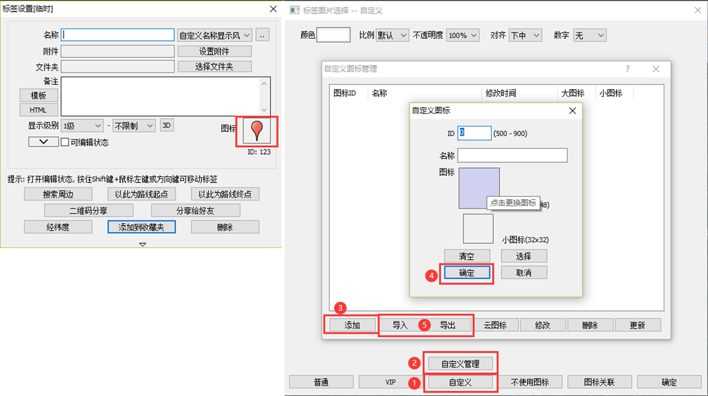 当您觉得奥维里面的图标不能满足工作需要时,可以自行设置图标进行使用,之后也可以将制作好的自定义图标导出分享给同事使用,在标签设置页面点击图标,点击【自定义】-【自定义管理】,点击【添加】,选择符合尺寸要求的图片进行制作,制作完成后可以导出给他人导入使用。