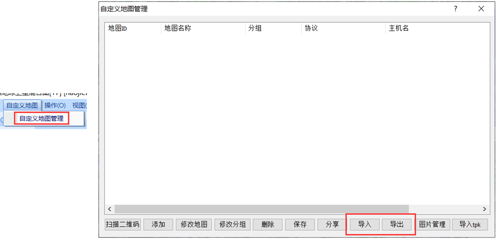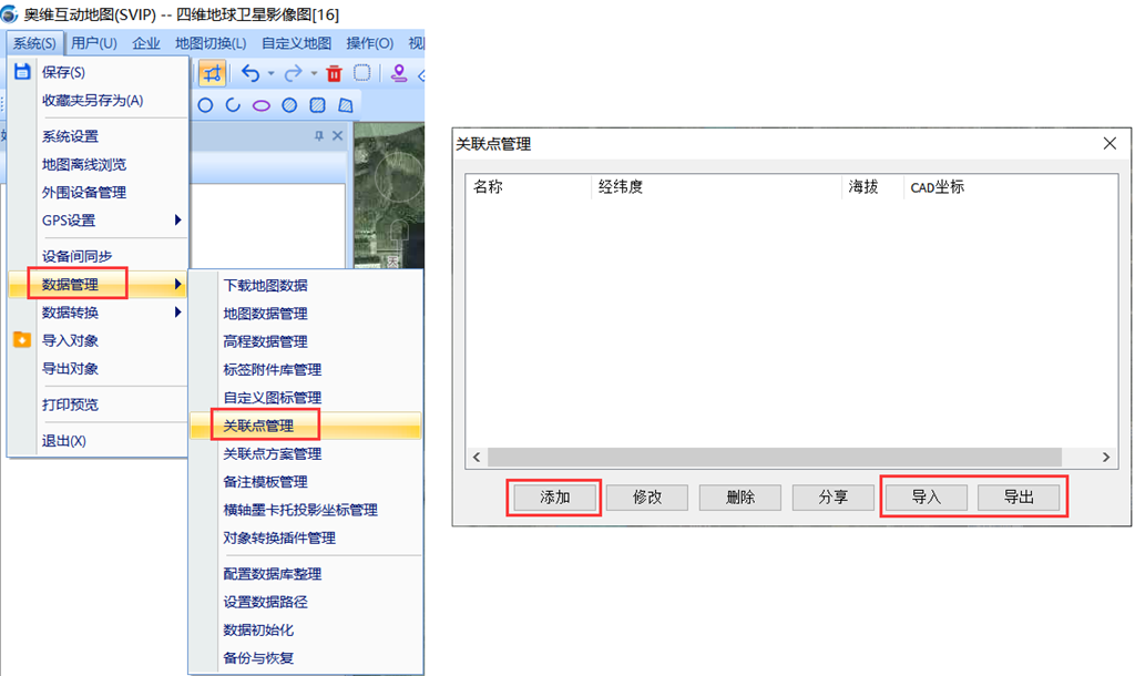 奥维支持添加自定义地图,例如在线地图或者航拍图都可以制作成自定义地图在奥维中浏览,点击【自定义地图】-【自定义地图管理】,在此界面可以进行添加,详细的添加步骤可以参考官网文档《如何导入TIFF格式的航拍图》。制作好的自定义地图可以点击窗口中的【导出】按钮,将文件分享给好友,好友在此界面【导入】文件即可添加浏览地图。