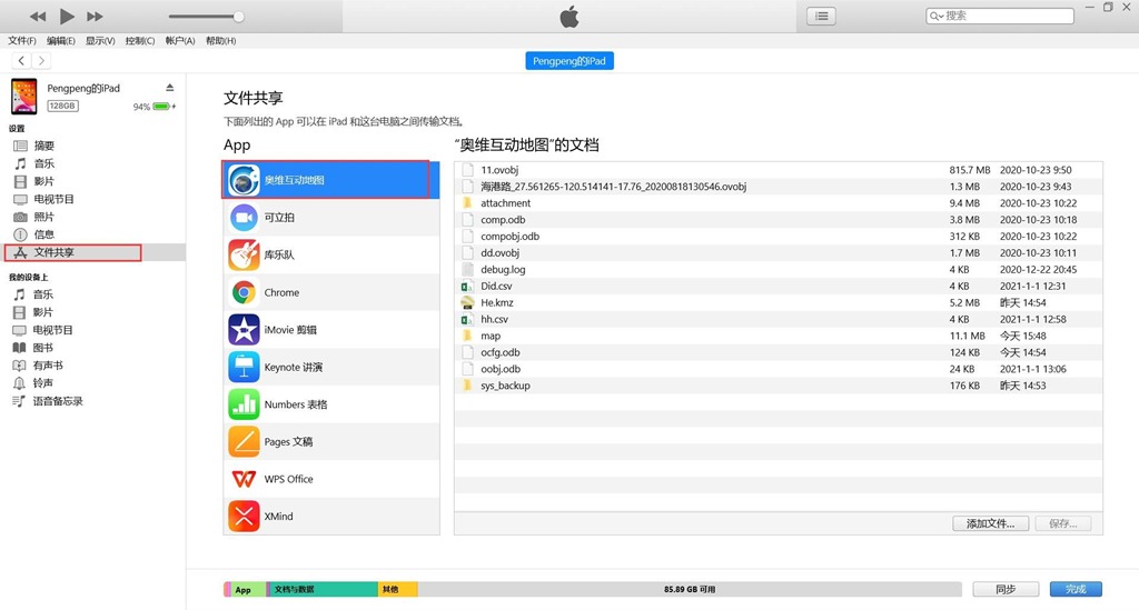 而苹果用户则需要通过iTunes将数据放到奥维根目录下,如下图所示。连接手机后,点击【文件共享】,找到奥维互动地图,将文件添加到奥维互动地图的目录下即可。