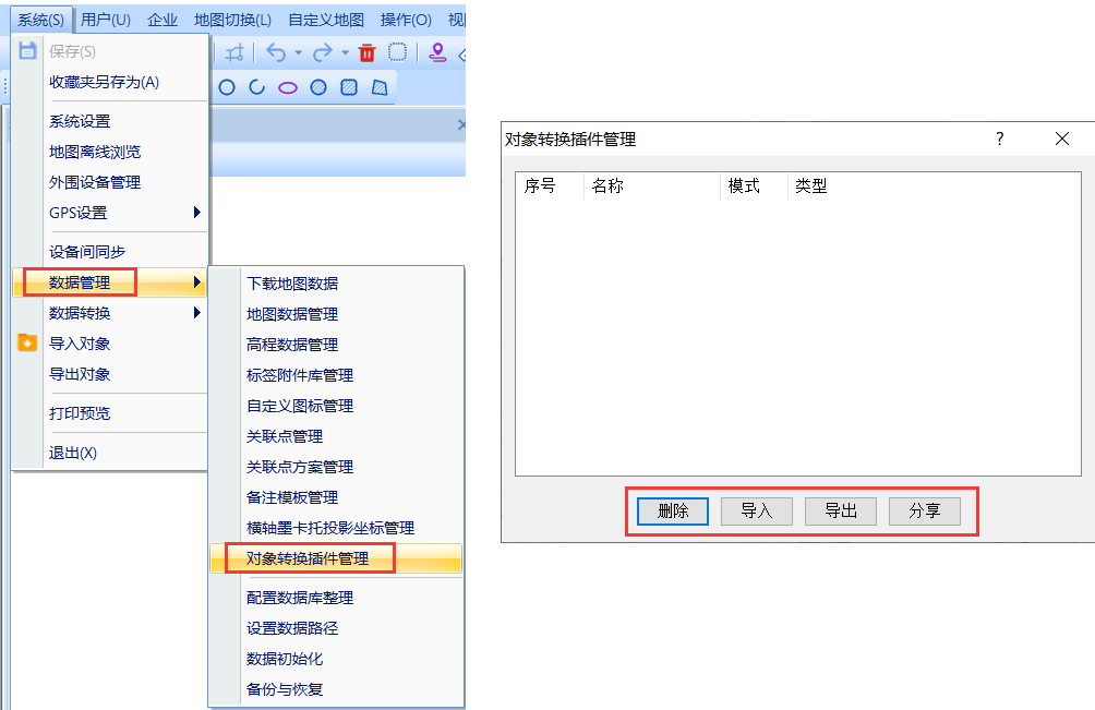 在[对象转换插件管理]窗口,我们可以进行删除、导入、导出、分享等操作。