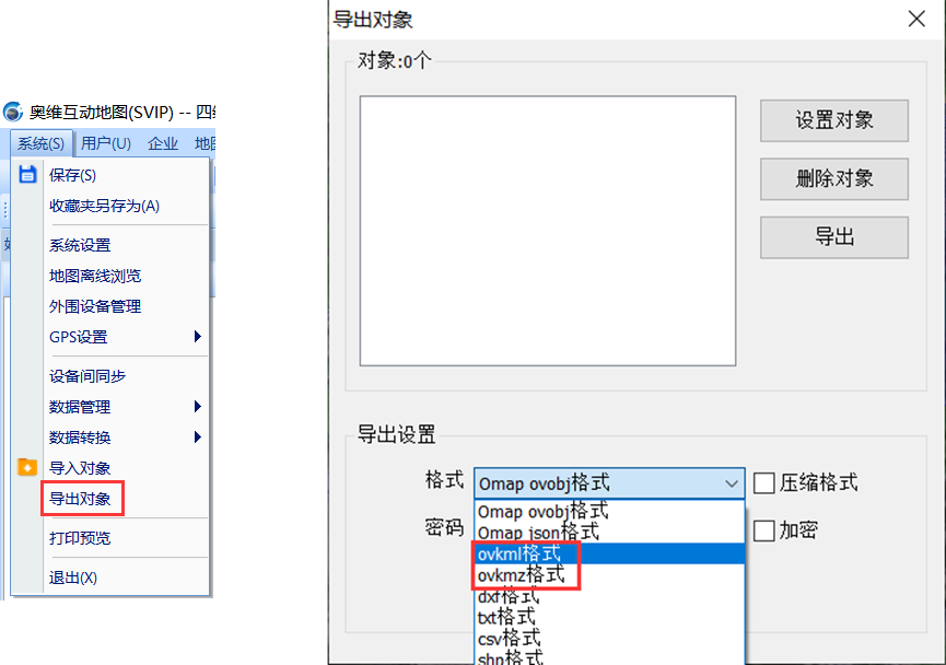 ①点击[系统]→【导出对象】→【设置对象】,勾选需要导出的奥维数据,点击【确定】;