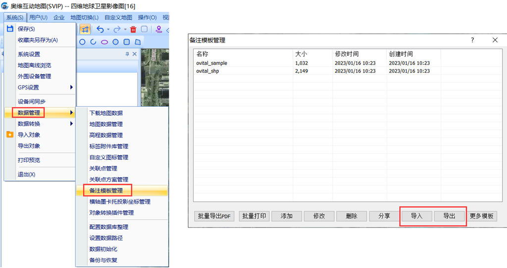 我们也可以通过【系统】-【数据管理】-【备注模板管理】打开窗口进行添加修改等操作, 好友分享的ovctp(备注模板)文件也可以在此界面进行导入。
