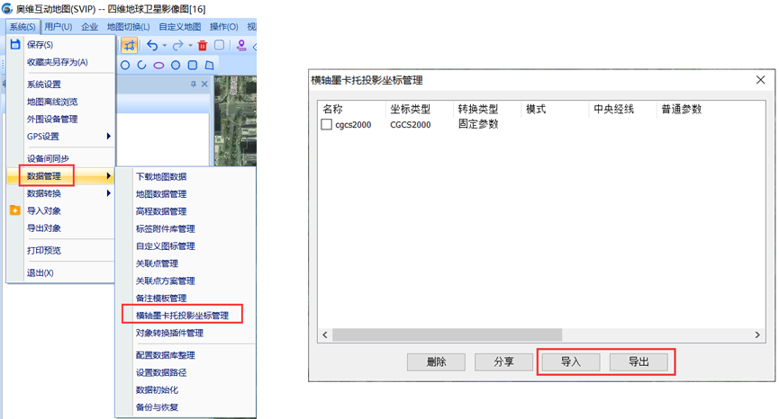 设置好的坐标配置可以分享给好友使用,好友分享的文件也可以导入,点击【系统】-【数据管理】-【横轴墨卡托投影坐标管理】,在此界面进行导入导出操作。