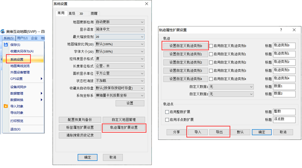 在轨迹设置中我们可以设置轨迹的线条颜色、线条宽度和不透明度等属性,当有很多轨迹要设置的情况时,我们就可以设置轨迹扩展属性,再设置属性直接选取配置即可。点击【系统设置】-【轨迹属性扩展设置】,在此界面可以设置轨迹类别,进行导入导出等操作。