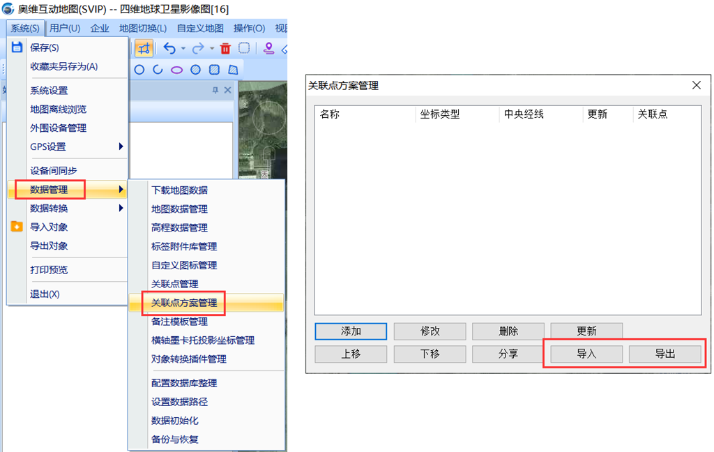 关联点方案是在导入导出CAD文件但不知道其坐标系的情况下使用,通过至少三个关联点来建立一个关联点方案,之后便可直接使用。点击【系统】-【数据管理】-【关联点方案管理】,在此界面进行添加、导入导出等操作。
