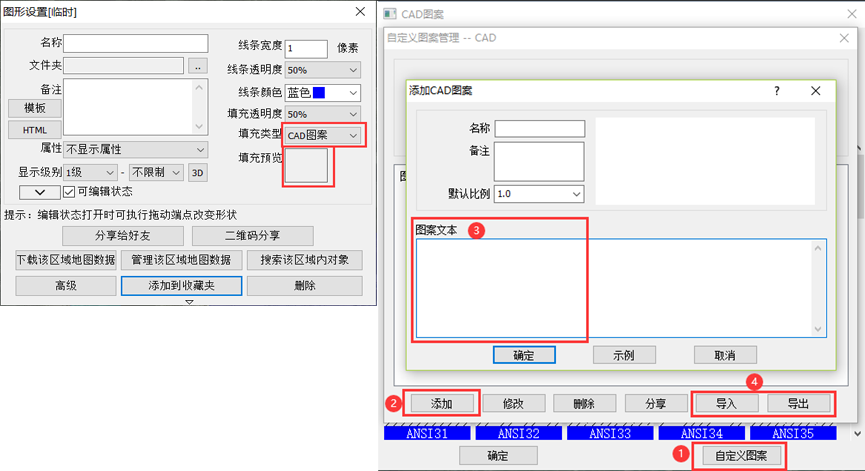 当您绘制图形,觉得图形填充图案不能满足您的需要时,可以自定义CAD图案使用,在图形设置界面,填充类型一项选择【CAD图案】后点击下方【填充预览】,点击【自定义图案】-【添加】,CAD图案是需要输入对应的图案文本,点击【示例】可查看样例,添加完成后可进行导入导出等相关操作。