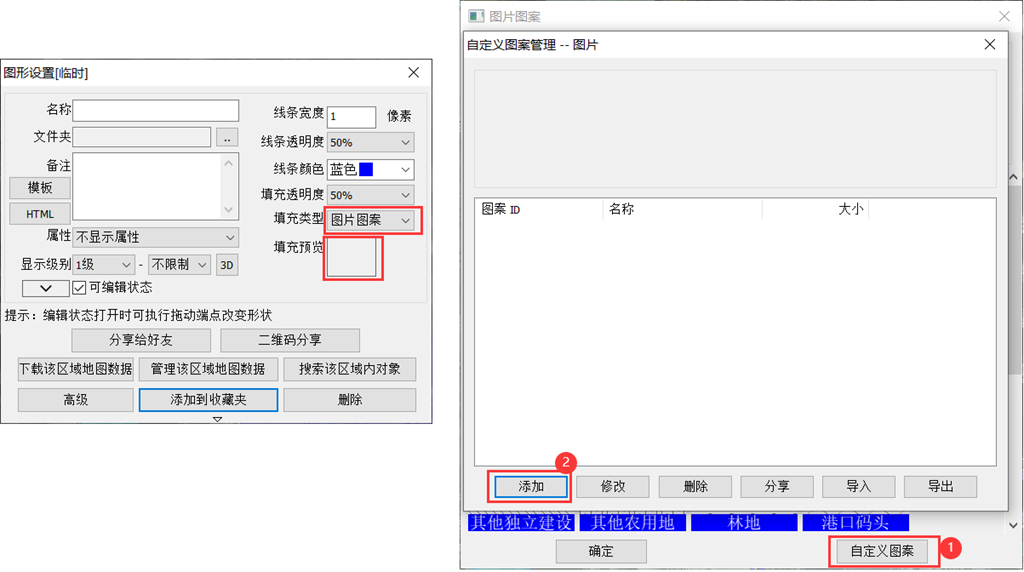 当您绘制图形,觉得图形填充图案不能满足您的需要时,可以自定义图案使用,在图形设置界面,填充类型一项选择【图片图案】后点击下方【填充预览】,点击【自定义图案】-【添加】,选择图片即可,需要注意的是,图片的长和宽不能超过64像素,否则无法添加,添加完成后可进行导入导出等相关操作。
