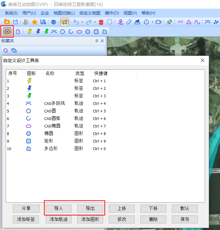 用户在设计工具条中可以事先设置好标签、轨迹、图形对应的属性,并且设置快捷键,之后就可以直接使用快捷键添加特定属性的数据。点击工具栏上的设置按钮,在此界面可进行添加、修改、导入导出等相关操作。