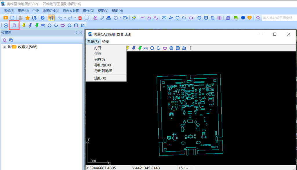 在导入对象窗口点击【导入】按钮,系统执行导入。导入完成后点击确定按钮,关闭简易CAD窗口,数据会显示在地图上,保存在收藏夹中。
