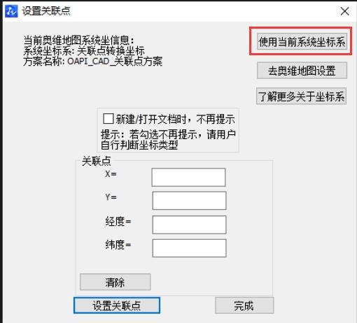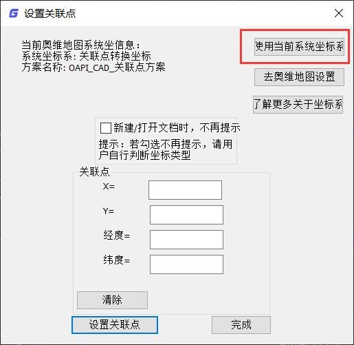 若奥维当前的系统坐标系与CAD文件的坐标系是一致的,那么可在[设置关联点]窗口点击【使用当前系统坐标系】,即可完成坐标系的设置。