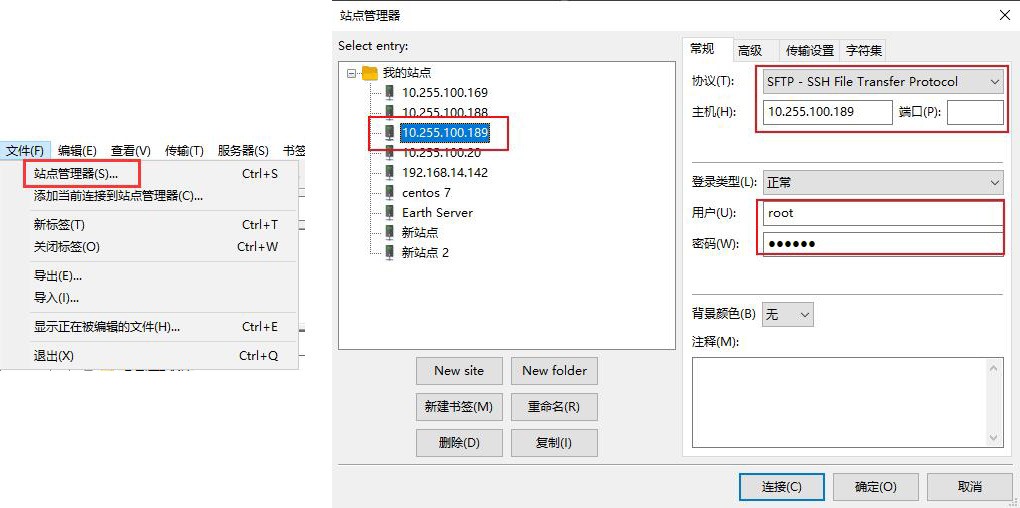 安装FileZilla后,新建一个站点,主机为Linux服务器的IP地址。设置协议、主机、登录类型等,如下图所示,点击【连接】。