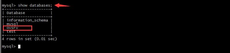 命令:【show databases;】,可以显示所有数据库,其中“ovsrv”为奥维企业服务器的数据库。