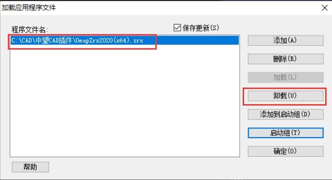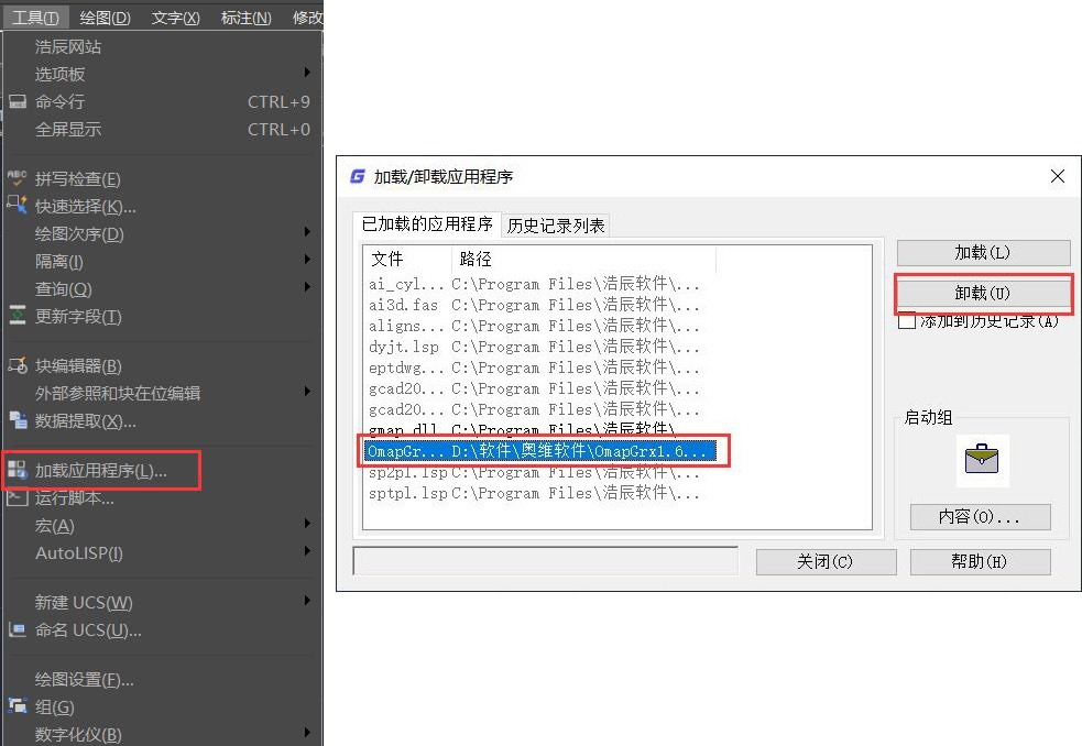 在[加载/卸载应用程序]窗口,选中已加载的OmapGrx,点击【卸载】,即可。