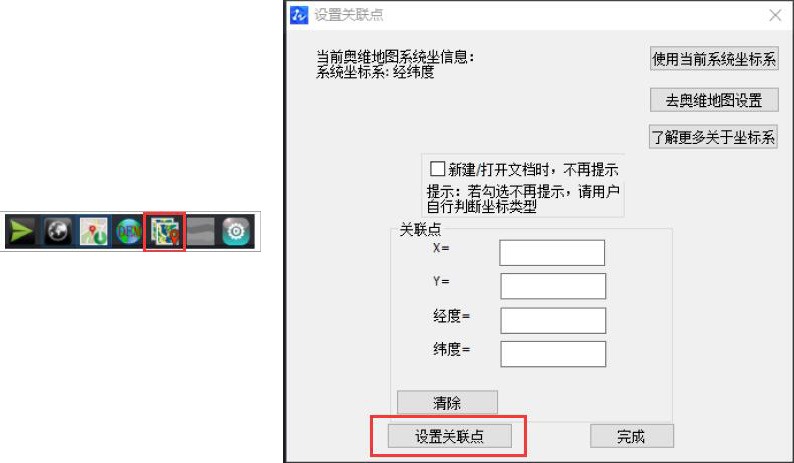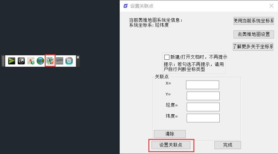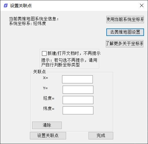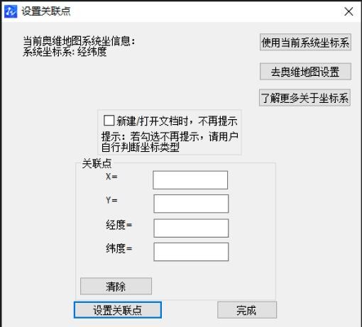 使用OmapCAD插件,首先要设置坐标系。默认情况下,每次启动浩辰CAD,会自动弹出[设置关联点]窗口,提示您设置坐标系。