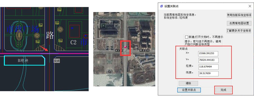 在CAD中选择一个点作为关联点,然后自动调转到奥维中,在与之对应的位置创建一个标签,完成后会自动跳转至CAD,将获取到的XY坐标和经纬度坐标填充到对应的输入框中,点击【完成】,即可设置好关联点。