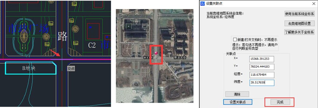 设置关联点:即建立CAD文件某点的平面坐标与经纬度坐标的对应关系。