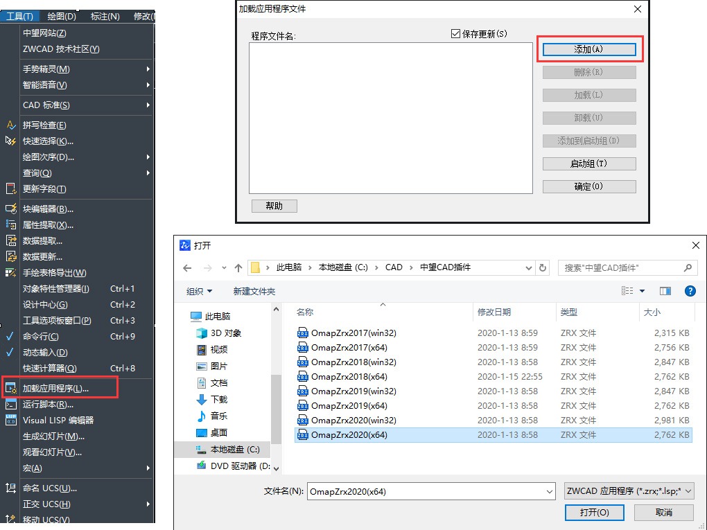传统界面:工具→加载应用程序→加载→选择插件版本→打开,即可。