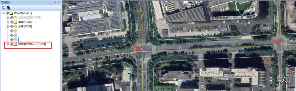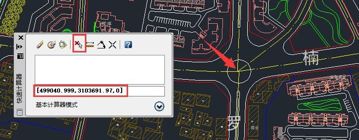 打开CAD文件,在图纸中找到一个特征明显的点,如交叉路口,地物拐角,这样便于用户在地图上准确的找到具体位置。如下图所示,箭头所指的道路交叉点。