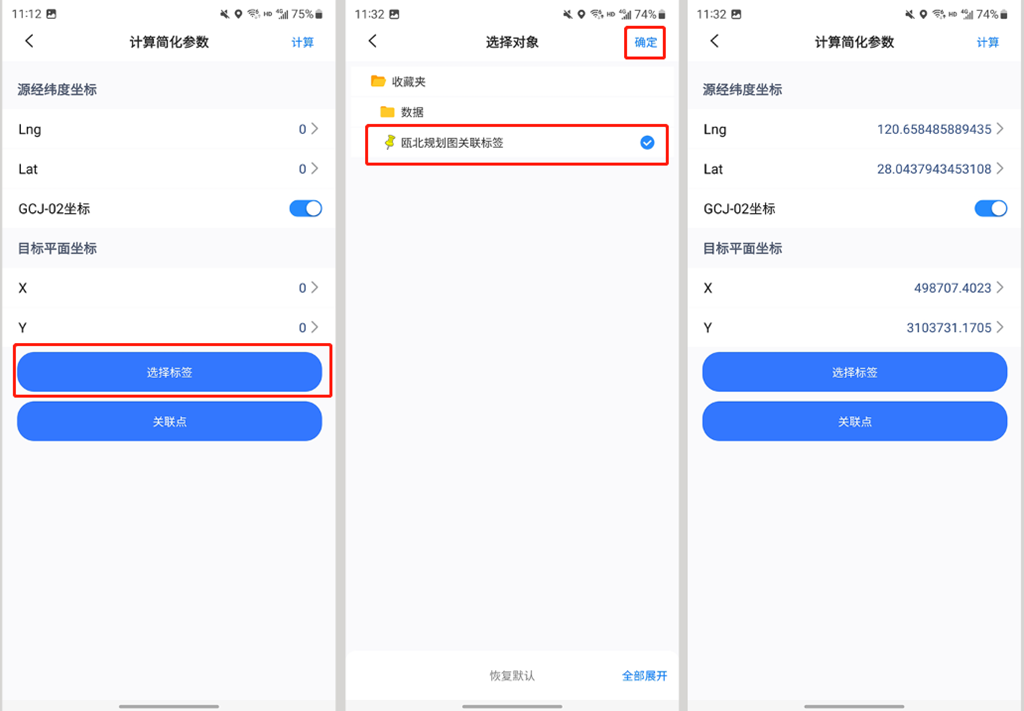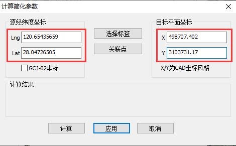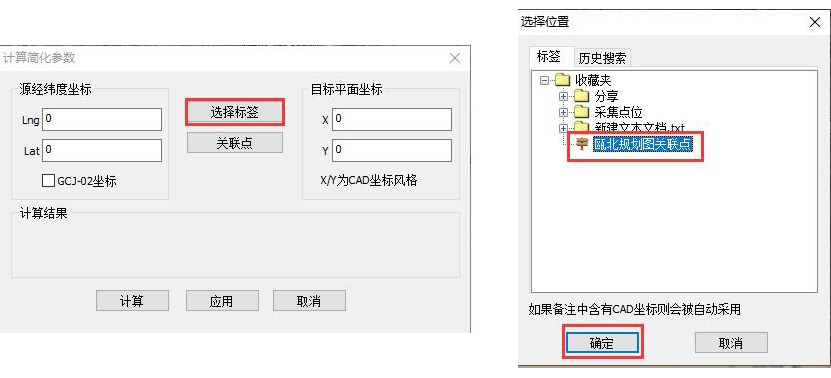 ☆若用户想通过关联点计算简化参数,且关联点保存在收藏夹中,那么点击【选择标签】,选择关联点标签,点击【确定】,系统会自动获取源经纬度坐标和目标平面坐标。