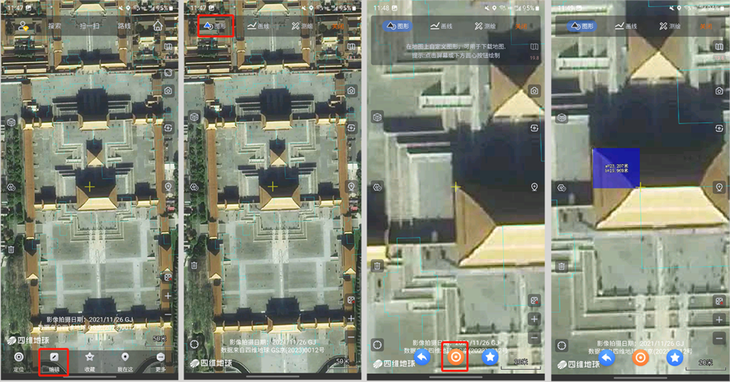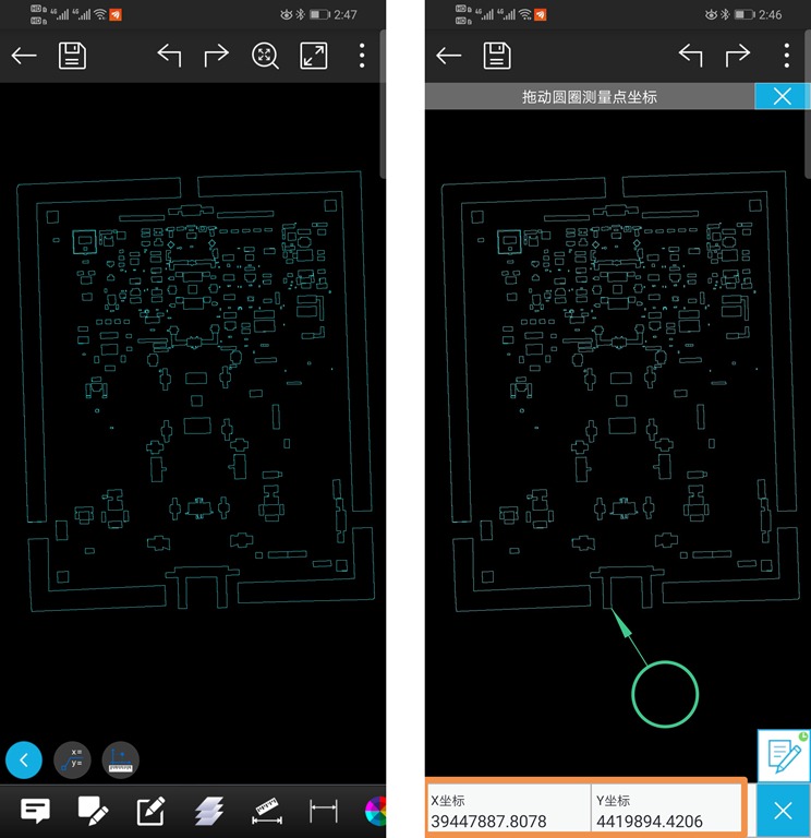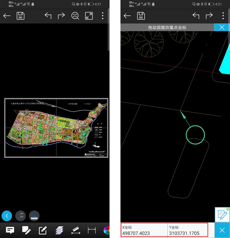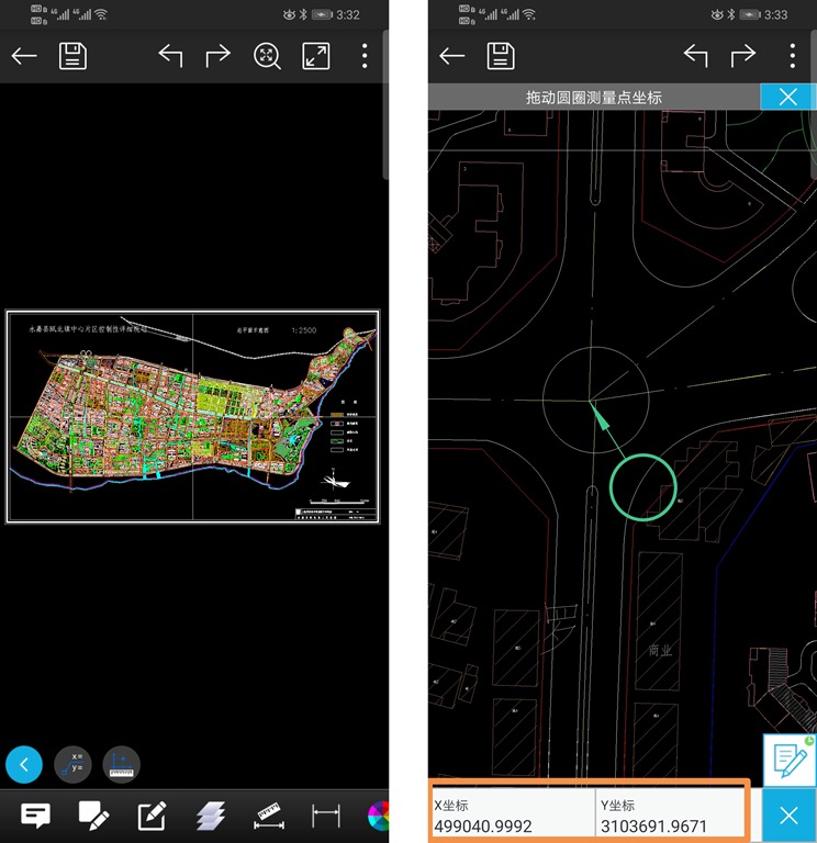 在手机上,使用CAD工具打开CAD文件,在图纸中找到三个特征明显的点,如交叉路口,地物拐角,这样便于用户在地图上准确的找到具体位置。