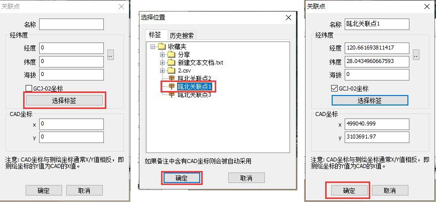 ☆若用户创建了三个关联点标签,点击【选择标签】按钮,选择第一个标签,系统会自动填入该点的经纬度坐标和与之对应的平面坐标,点击【确定】按钮,即可添加一个关联点。以此类推,添加三个。