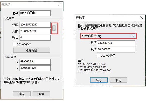 ☆若用户已有坐标点的经纬度坐标和与之对应的平面坐标,直接填写经纬度坐标和CAD坐标。输入经纬度时,可以设置经纬度的格式,有“度”“度分”“度分秒”三个格式。另外,若用户的经纬度坐标为GCJ-02坐标(中国GCJ-02经纬度),需要勾选【GCJ-02坐标】;如果为CGCS2000地理坐标,那么不需要勾选【GCJ-02坐标】。