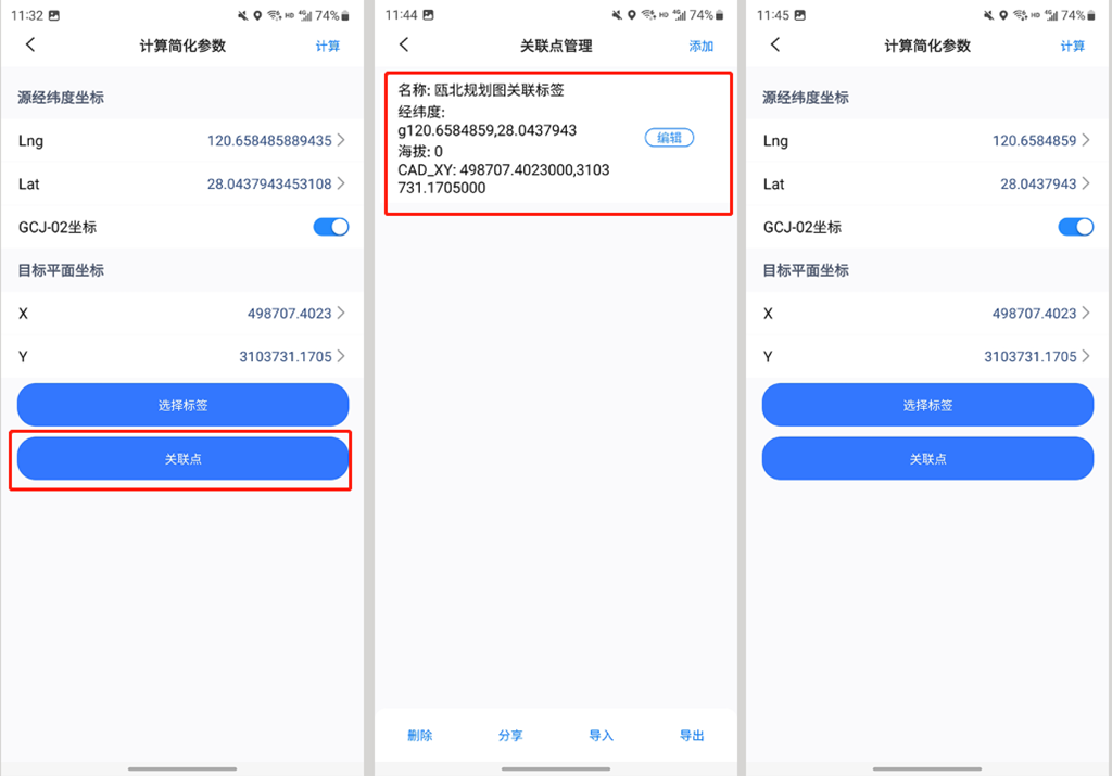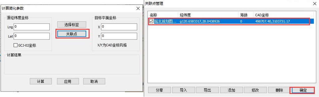 ☆若用户已将关联点保存在了[关联点管理]中,那么可点击【关联点】,勾选关联点,点击【确定】,系统会自动获取源经纬度坐标和目标平面坐标。