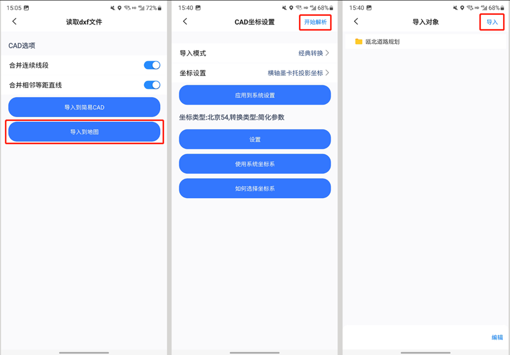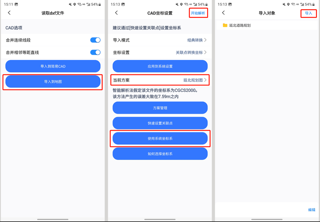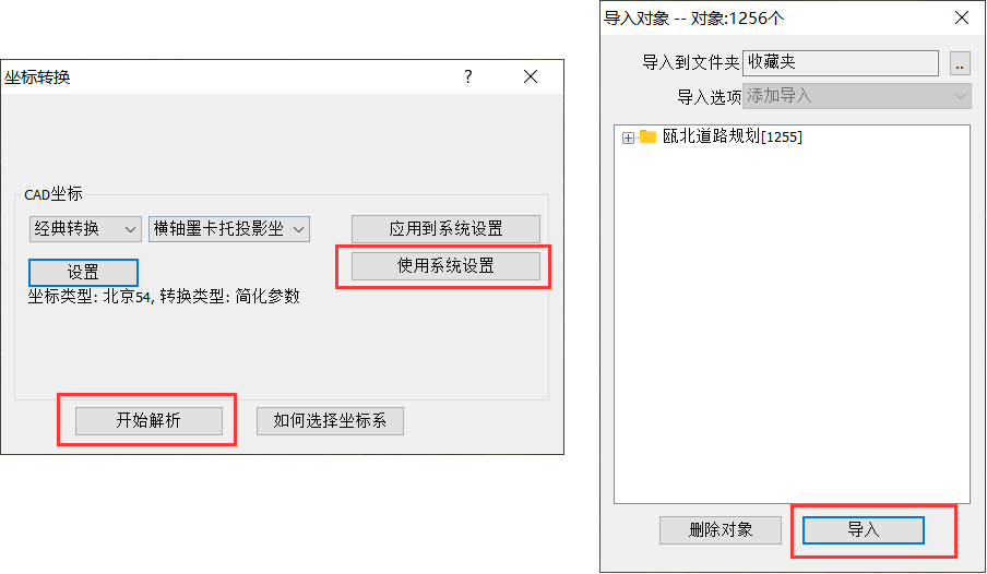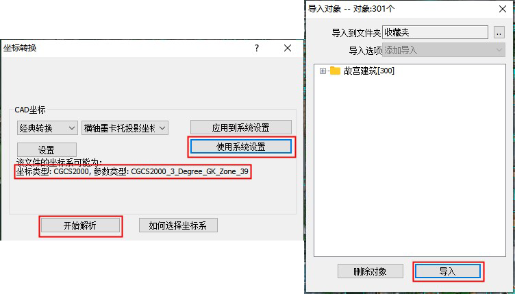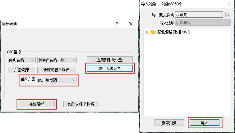 进入[坐标转换]窗口,由于之前已经设置好了系统坐标系,因此这里直接点击【使用系统设置】,当前方案选择刚才创建的关联点方案。点击【开始解析】,系统解析文件;点击【导入】,系统执行导入。