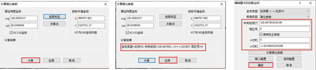 填写好源经纬度坐标和目标平面坐标后,点击【计算】,即可计算出简化参数。