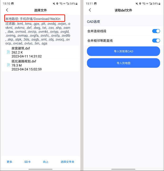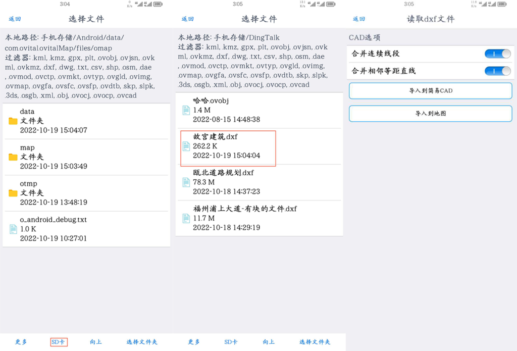 系统自动打开奥维根目录,选择CAD文件。如果用户没有将CAD文件保存在奥维根目录下面,那么就点击SD卡,找到保存CAD文件的目录。