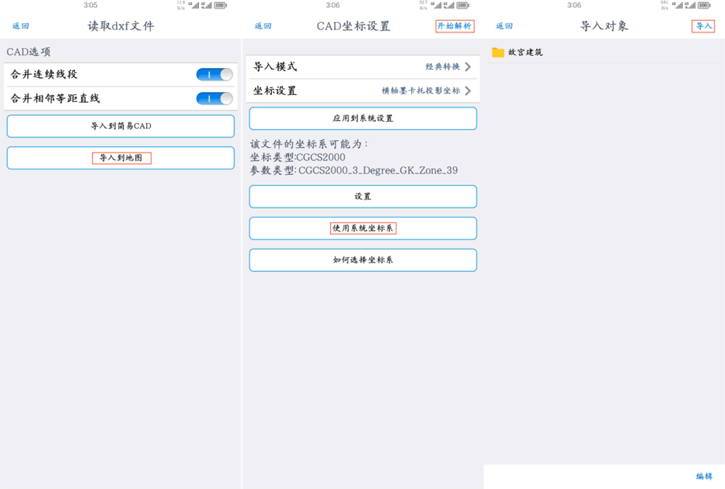 (3)若CAD文件的坐标系为分带投影(3°分带或者6°分带)的北京54、西安80、CGCS2000平面坐标系,那么使用固定参数导入。