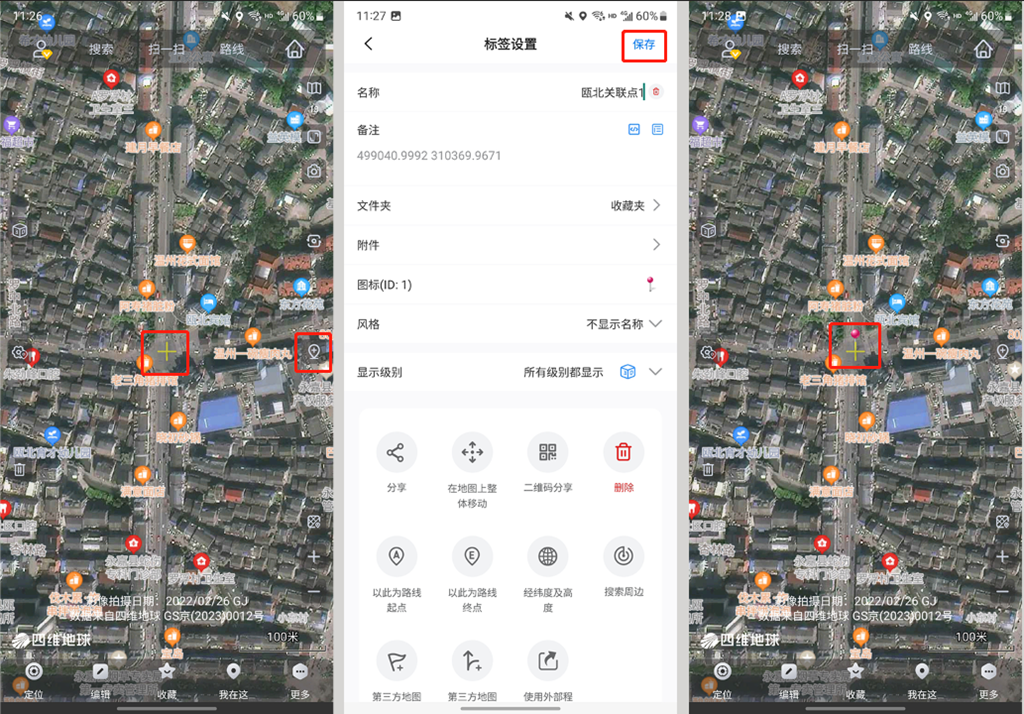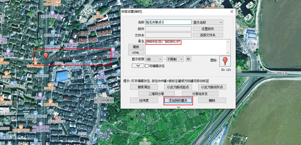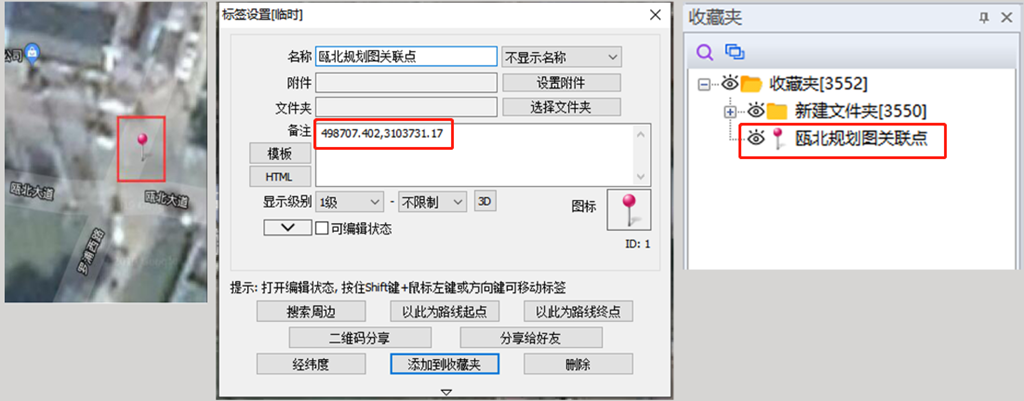 然后在奥维中找到对应的点,在该点处创建标签,将该点的CAD坐标填写在备注栏目下面(只需要填写X和Y,不需要高程),输入名称,点击【保存】,保存到收藏夹。这样,就创建好了关联标签。