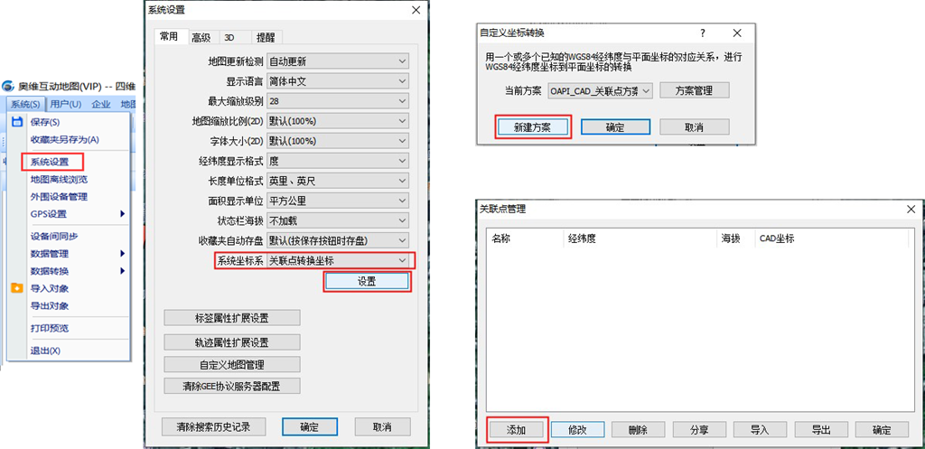 创建完三个关联标签后,点击[系统]→【系统设置】,点击【系统坐标系】下拉框,选择【关联点转换坐标】,点击【设置】按钮,进入[自定义坐标转换]窗口;点击【新建方案】按钮,点击【添加】,进入[关联点]窗口。