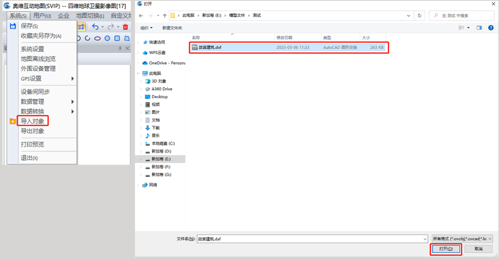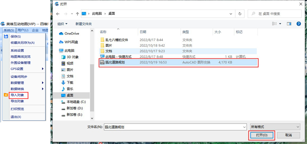 在奥维中,点击[系统]→【导入对象】,选择DXF/DWG文件,点击【打开】。