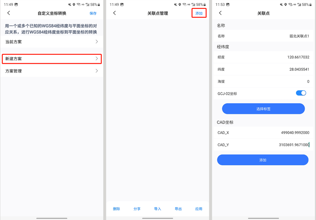 进入[自定义坐标转换]页面;点击【新建方案】按钮,点击【添加】,进入[关联点]页面。