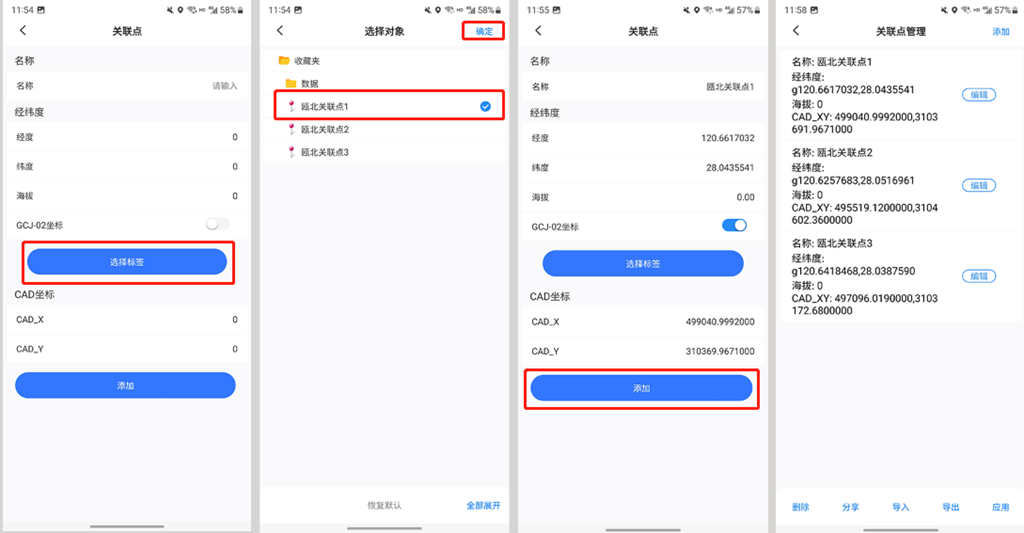 ☆若用户创建了三个关联点标签,点击【选择标签】按钮,选择第一个标签,点击【确定】按钮,系统会自动填入该点的经纬度坐标和与之对应的平面坐标,点击【添加】按钮,即可添加一个关联点。以此类推,添加三个。