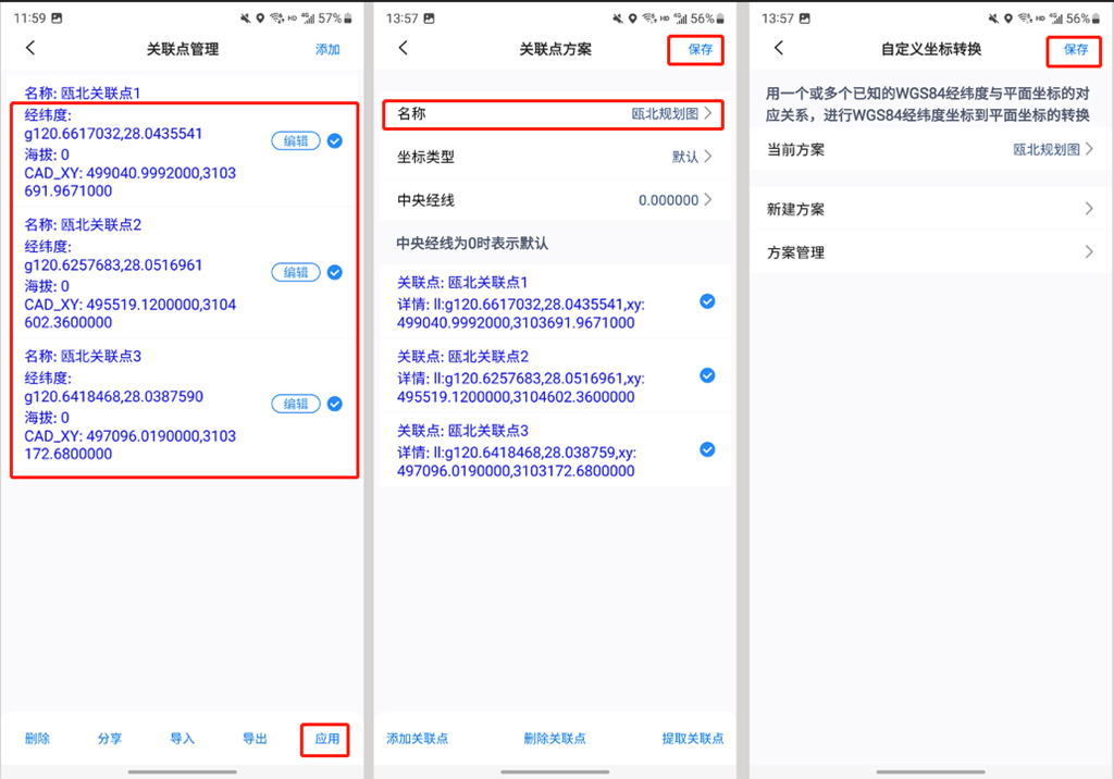 添加三个关联点后,勾选,点击【应用】,输入名称,坐标类型和中央经线保持默认,点击【保存】;当前方案选择刚创建的方案,点击【保存】,即可完成坐标系的设置。