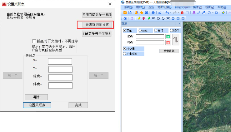 若您已知CAD文件的坐标系参数,且没有在奥维中设置,那么可在[设置关联点]窗口点击【去奥维地图设置】,自动跳转至奥维中。