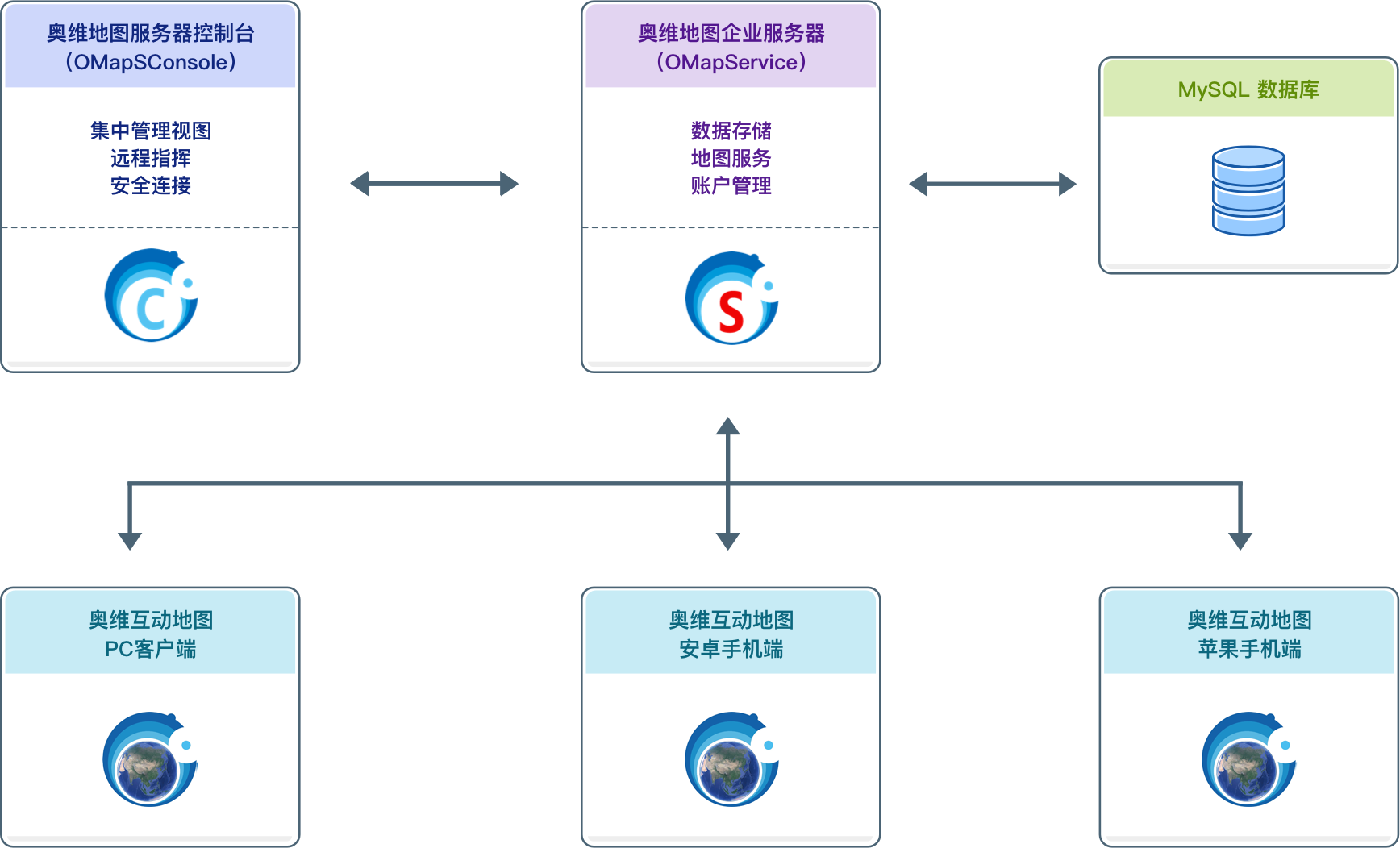 奥维互动地图企业方案是基于客户自部署的奥维互动地图服务器套件,为企业用户提供的全方位解决方案。通过允许企业自己架设服务器,并由企业自主来运维,可实现 安全的数据管理,集约化的数据共享管理,严格的权限控制,方便的远程协助,多级拓扑结构,企业内网部署,集中授权,它由服务器组件,控制台组件,数据库组件以及客户端组成。
