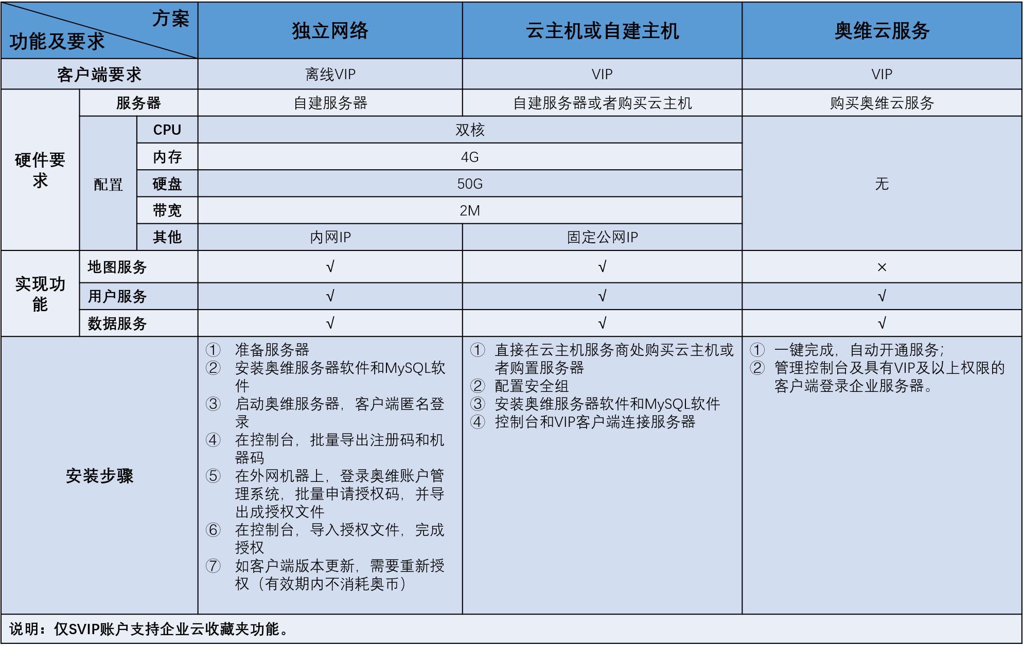 奥维互动地图企业服务器有三种部署方式,分别是内网部署、云主机以及云服务。内网部署指服务器可部署于与互联网隔离的独立网络中(内外网隔离),用户的网络安全性很高;云主机部署指用户通过阿里、腾讯、百度等云主机厂商购买云主机,下载奥维服务器软件,自行完成安装,用户自行管理服务,此方式部署用户对服务器具备完全的控制权,灵活性高;云服务指用户直接从官网上购买奥维的企业云服务,无须安装软件,一键完成。